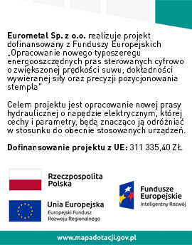 Eurometal Sp. z o.o. realizuje projekt dofinansowany z Funduszy Europejskich „Opracowanie nowego typoszeregu energooszczędnych pras sterowanych cyfrowo o zwiększonej prędkości suwu, dokładności wywieranej siły oraz precyzji pozycjonowania stempla” .