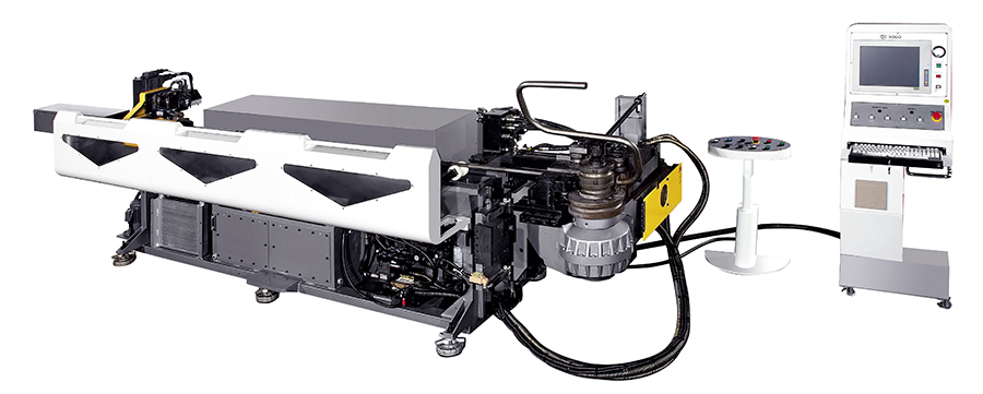 Giętarki hydrauliczne SOCO serii V wyposażone w sterowanie CNC oraz napędy serwomotorami dla 4 osi, z możliwością montażu do 3 stosów matryc. Unikalny system napędu głowicy gnącej DGT, wykorzystujący przekładnię zębatą i napęd serwomotorem, zapewnia jeszcze większą wydajność i stabilność gięcia. Maszyny umożliwiają gięcie promieni równych 1D (w zależności od współczynnika wydłużenia materiału) oraz gięcie dużych promieni na rolkach.