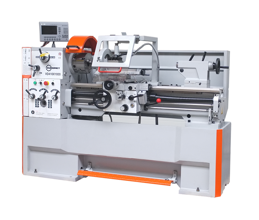 Tokarka uniwersalna EUROMET VD410x1000 umożliwia obróbkę pełnego zakresu gwintów, posiada również blokadę wyboru posuwu: przez śrubę lub za pomocą wału, wyjmowany mostek, bezstopniowo regulowane obroty wrzeciona z możliwością ustawienia stałej prędkości skrawania.