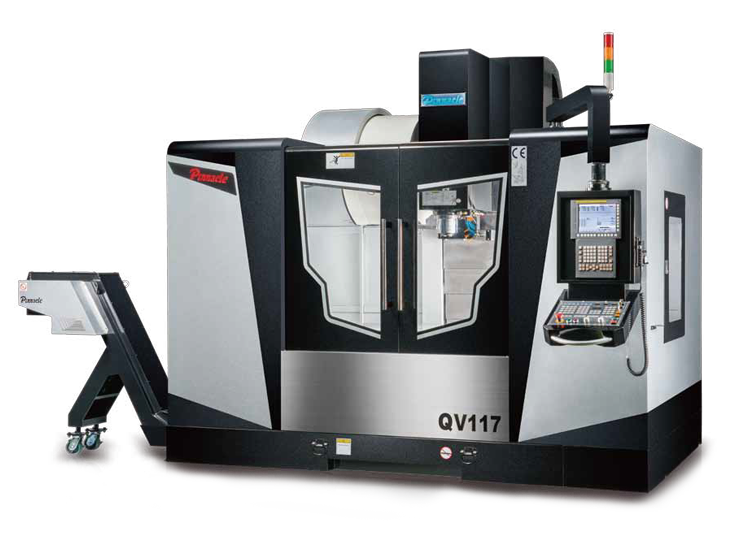 Maszyny (Centrum obróbcze PINNACLE QV137 - prowadnice ślizgowe (4 szt. w osi Y) serii QV są 3-osiowymi pionowymi centrami obróbczymi ze stołem krzyżowymi, realizującym ruchy w osi X/Y oraz wrzeciennikiem realizującym ruch pionowy w osi Z. Prowadnice ślizgowe we wszystkich osiach zapewniają wysoką sztywność, umożliwiając przeprowadzenie ciężkiej obróbki. W celu zapewnienia jeszcze większej sztywności oraz obciążenia stołu maszyny QV wyposażone są w 4 prowadnice w osi Y. Pionowe centra obróbcze serii QV mogą zostać wyposażone w stół obrotowy CNC, stając się 4-ro lub nawet 5-cio osiowymi maszynami.