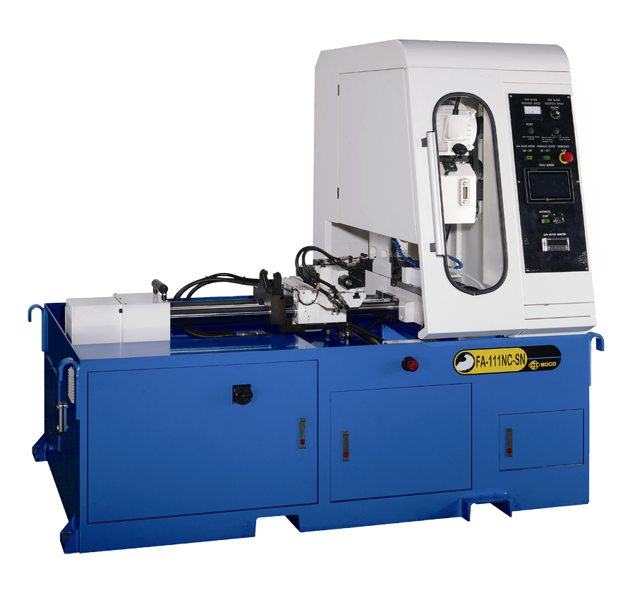 Przecinarka tarczowa SOCO FA127NC to maszyna automatyczna z możliwością cięcia tylko pod kątem prostym. Maszyna te możę być wyposażona w podawanie hydrauliczne bądź za pomocą serwomotoru. Seria maszyn NC-SN jest przeznaczona do tych odbiorców którzy liczą koszty materiału. Dzięki opatentowanemu układowi zaciskowo-podającemu zminimalizowano odpad do 20 mm. Jest to światowy patent firmy SOCO.